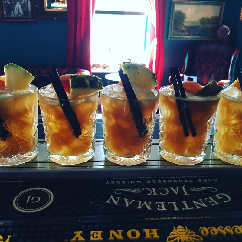 Fill a double old fashioned glass with rocks ice, and leave to the side. Throw everything in your shaker, and hammer the life out of it. Strain into your glass, and garnish with basically any and all tropical fruit you’ve got at hand. Favourites include chunks of fresh pineapple or half a lime hulled out, half filled with overproof rum, then SET ON FIRE. Just make sure you put it out before giving it to the customer- we do not encourage customers to play with fire. We’re totally fine though.😂